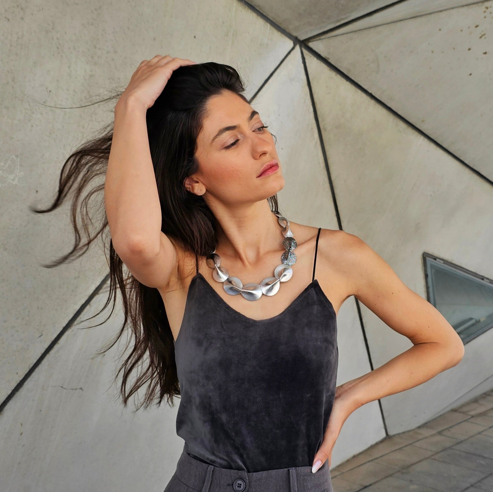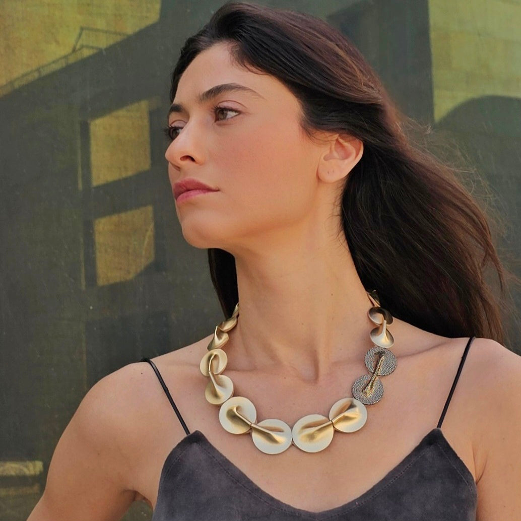 Regular price $300.00A unique handcrafted statement necklace combining Gold with a touch of brass, for a minimalistic contemporary feel.